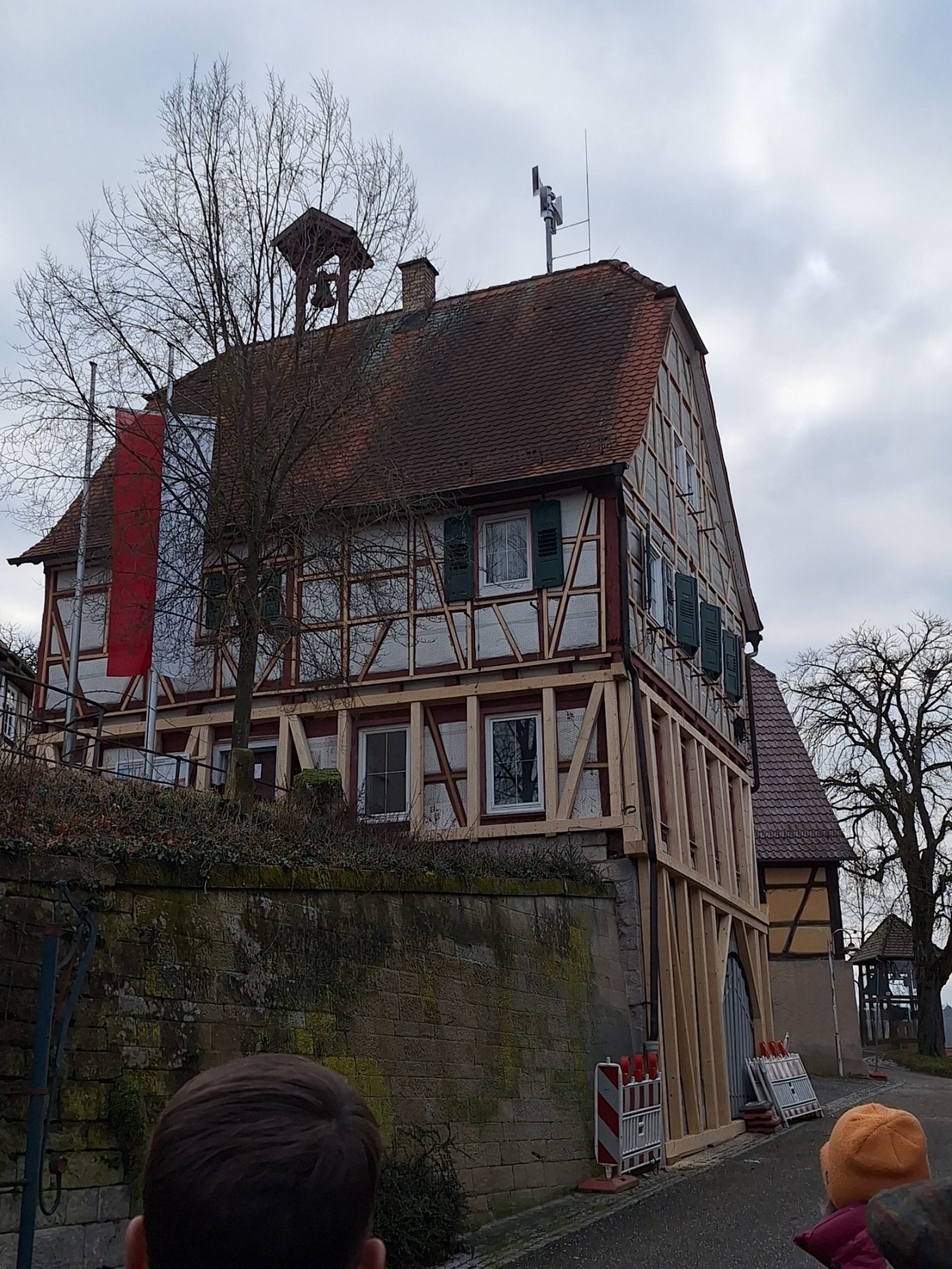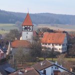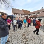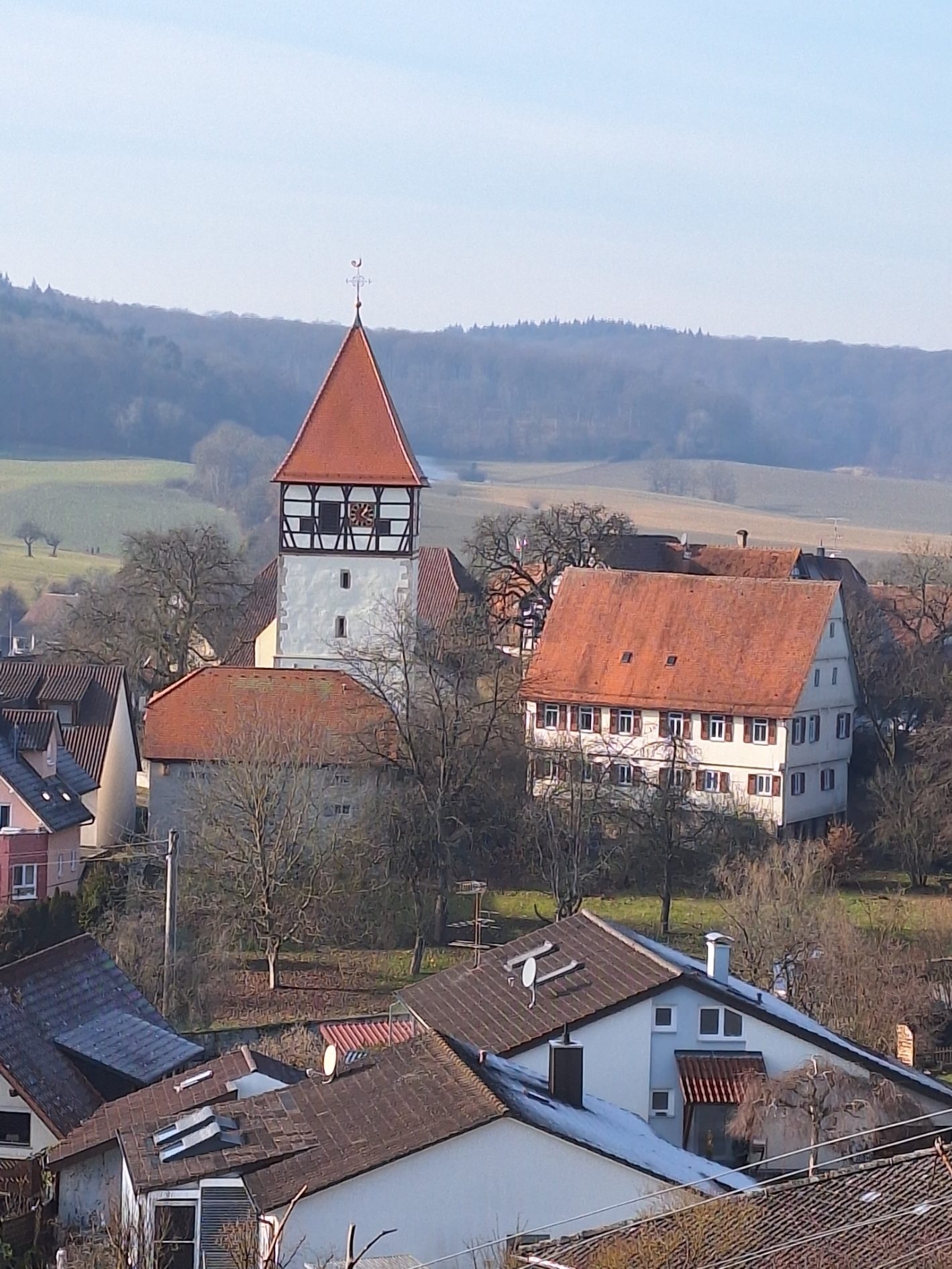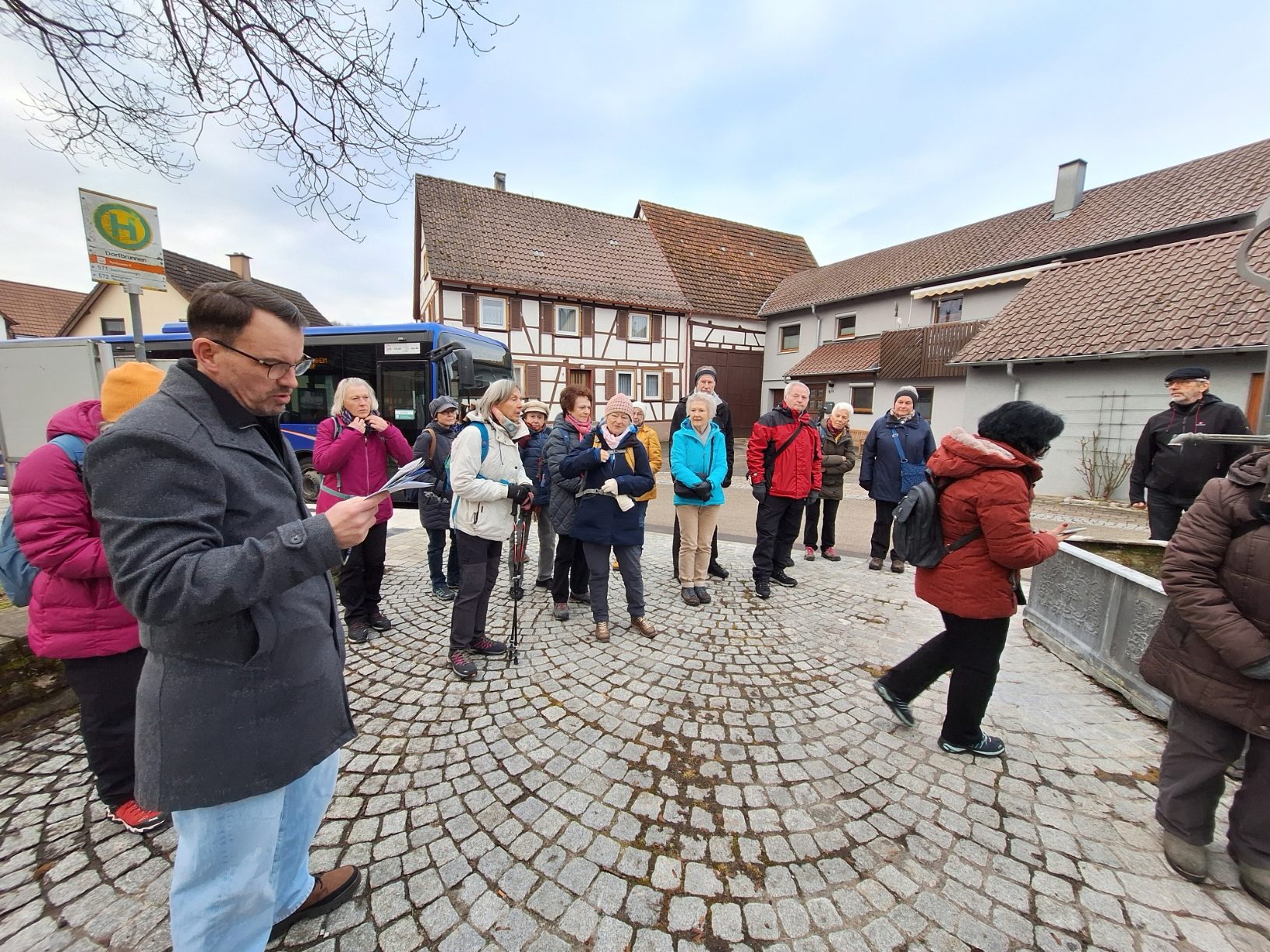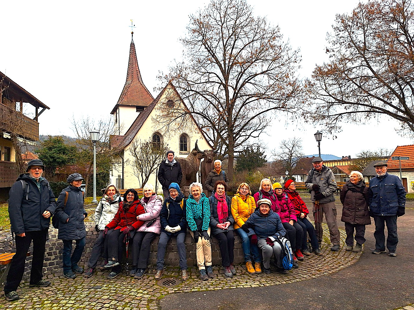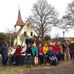 Ziel unserer Wanderung war der Höhenweg über dem Kirbachtal. Ein verbindendes Element ist der Sachsenheimer Weg von Häfnerhaslach über Ochsenbach- Spielberg- Kleinsachsenheim-Großsachsenheim. 23 Wanderer aus Markgröningen, Tamm, Marbach und Asperg fuhren mit Öffenlichen zum Startpunkt Badbrunnen in Häfnerhaslach, wo sie schon vom Vorsitzenden der dortigen Ortsgruppe erwartet wurden. Er berichtete über Aktuelles und aus der Historie des Dorfes beim anschließenden Rundgang. Der Name Häfnerhaslach taucht zum ersten Mal 1403 in einer Urkunde auf und deutet auf das Häfnerhandwerk hin, das hier ehemals von 100 Handwerkern ausgeübt wurde. Die Gemeinde gehörte zum Kloster Kirbach. Das Pfarrhaus war einst ein Beginenkloster. Die neu renovierte Remigiuskirche hebt sich heute von den andern historischen Gebäuden positiv ab, an denen der Zahn der Zeit nagt und die wegen Kapitalmangel nicht renoviert, sondern abgestützt und mit Metallbändern zusammengehalten werden. Ein Hingucker ist die ehemalige, voll funktionsfähige Kirchturmuhr, zu bestaunen in einem ebenerdigen Glashaus unterhalb der Kirche.