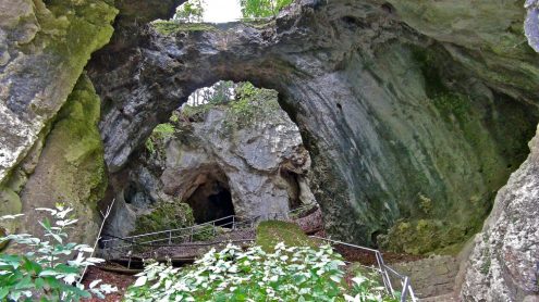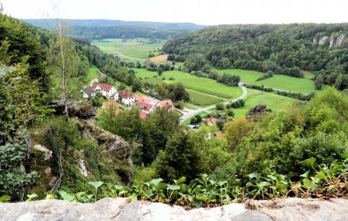 5.Tag: Absoluter Höhepunkt der Wandertage war die Tour, die wir von Muggendorf aus starteten. Durch den hübschen Ort kamen wir bergan über Treppen auf den Wanderweg und gingen durch den Wald unterhalb der Oswaldhöhle in Richtung Quackenschloss. Bald zweigte ein schmaler Pfad ab zu der rund 18m langen sagenumwobenen Karsthöhle.(Übrigens wird die Rauchwacke, ein Gestein, vor Ort Quacke genannt). Kurz danach erreichten wir den Adlerstein, einen markant aufragenden Dolomitfelsen. 1905 brachte der Fränkische Schweiz Verein eine Eisentreppe an, über die man auf den Stein gelangt, wofür man mit einer schönen Aussicht belohnt wird. Vorbeiwandernd an Engelhardsberg erreicht man die Riesenburg, die imposanten Reste einer ausgedehnten Karsthöhle. Als hätte eine Riesenmaus Löcher aus dem Gestein genagt, so wirken die zahlreichen runden Löcher im Gestein. Durch diese steinige Welt, die von Flechten, Bäumen und Sträuchern besiedelt ist, führen zahlreiche Treppen. Wir durchquerten staunend diese steinerne Landschaft und kamen talabwärts zur Wiesent. Weiter ging es dann nach Doos und an der Aufseß entlang bis zur Kuchenmühle. Nachdem wir uns gestärkt hatten, wanderten wir zurück nach Doos, wo uns der Bus erwartete. Dieser erfüllte Tag wurde gekrönt durch das „süße Büffet“, das nach dem Abendessen serviert wurde.