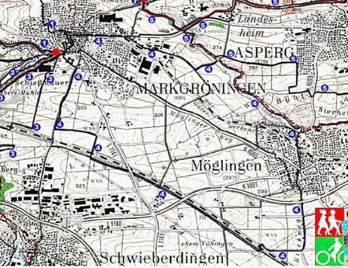 Unser Weg führt über den Fußgängersteg zur Stadthalle, anschließend durch das Schul- und Sportgelände (Benzberg) zur alten Schwieberdinger Straße. Auf dieser Straße geht es weiter in Richtung Schwieberdingen / Schnellbahn. Nach dem Bauernhof biegen wir links ab und wandern in östlicher Richtung bis zur nächsten größeren Feldwegkreuzung (Markierung auf dem Boden beachten). Hier rechts über die Bahn, dann links der Schnellbahntrasse entlang und diese an der dritten Brücke erneut nach links überqueren. Es geht weiter nach rechts und ca. 200m parallel zur Bahn, dann halblinks weg bis zum zweiten Weg, auf dem wir nach links in Richtung Möglingen abbiegen (auf den Kirchturm zu). Nun geht es weiter auf der Wagnerstraße bis zur Volksbank, von dort in die Bahnhofstraße, über die Bahngleise und in der Senke nach links in die Mühlwiesenstraße. Wir überqueren die Brücke und wandern an der Reithalle und dem CVJM-Heim vorbei bachabwärts (Leudelsbach). Wir bleiben auf der rechten Seite und folgen dem Albvereinsweg (blaues Kreuz) bis zum geteerten Weg, überqueren nach links die Brücke und wandern bei der nächsten Wegkreuzung nach rechts, direkt auf Markgröningen zu. Über den Maulbronnerweg, die Bahnhofstraße, Ostergasse, Wettegasse und die Mühlgasse kehren wir zum Ausgangspunkt zurück.