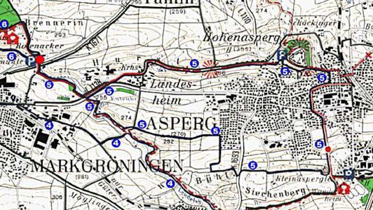 Wir überqueren die Straße nach Tamm und wandern am Leudelsbach entlang bis zur Straße nach Asperg. An der Klinik und dem Behindertenheim vorbei geht es hinauf zum Wasserturm und über die Obere Hurst zum Hohenasperg (Überquerung der Straße Asperg – Tamm). Vor dem Hauptportal der Festung wandern wir nach rechts und auf der Ostseite bergab zum Schwitzgässle, anschließend durch Asperg. Wir folgen der Karlsstraße, biegen dann rechts in die Bahnhofstraße ein , danach links in die Wilhelmstraße und überqueren die Eglosheimer Straße. Durch die Osterholzstraße und Pflugfelder-Straße gelangen wir zum Kleinaspergle. Von dort geht es auf dem Höhenrücken nach Westen und nach Überquerung der Straße Möglingen – Asperg (Weg ca. 50m links versetzt) führt der Weg zum westlichen Stadtrand von Asperg (Hummelbergstraße). Von hier geht es weiter nach Westen zum Leudelsbach, diesem entlang bis zur Straße Markgröningen – Asperg, die wir überqueren. Von hier gehen wir auf dem ersten Teilstück dieser Wanderung wieder zurück zu unserem Ausgangspunkt.