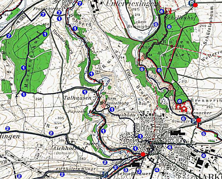 Wir wandern vom Spitalplatz (Spitalgebäude ; Pfründnerhaus, 1509 erbaut ) durch die Mühl– und Kirchgasse vorbei an der doppeltürmigen ev. Bartholomäuskirche (13.Jh.) zum Marktplatz mit Marktbrunnen. Das historische Rathaus wurde 1441/42 erbaut . In der Schloßgasse 8 steht das wohl älteste Privathaus aus dem Jahre 1347.Der Weg führt vorbei an der Zehntscheuer und dem Landesfruchtkasten. Auf der rechten Seite steht das einstige Schloß, in welchem heute das Helene-Lange–Gymnasium untergebracht ist. Bevor wir durch das Obere Tor die Altstadt verlassen, gehen wir an dem 1630/31 erbauten Wimpelinhaus vorbei. Im Wohngebiet „Auf Hart“ biegen wir rechts in den Platanenweg ein, dann weiter geradeaus durch die Anton-Bruckner-Str. und auf den Feldweg durch die Weinberge St.Johännser (Lettenbödle). Ein Abstecher von hier zum Schlüsselberg (ehem.Schlüsselburg) mit Aussicht auf Talhausen und zum Stromberg ist empfehlenswert. Unser Weg führt weiter nach Talhausen, durch das Glemstal am Klärwerk vorbei. Nach ca. 1,7 km Überquerung der Glems, dann nach ca. 270 m links den Wiesenpfad (Markierung auf dem Asphalt beachten ) zur Frauenkirche gehen. Von hier haben wir einen schönen Blick auf Unterriexingen. Wir gehen weiter bergauf zum Ostlandkreuz und durch den Muckenschupf. Von hier ist ein Abstecher zum Naturdenkmal Siegental anzuraten. Unser Weg führt nach links am Waldrand entlang auf die Feldhochfläche (schöner Blick auf die eindrucksvolle Westansicht von Markgröningen). Weiter geradeaus über den Bergweg ins Glemstal nach Talhausen. Die Glems aufwärts, vorbei an der Papiermühle, der unteren Mühle, dem Sportplatz und der Spitalmühle zur Vaihinger Straße. Über diese aufwärts gelangen wir wieder zum Ausgangspunkt zurück .