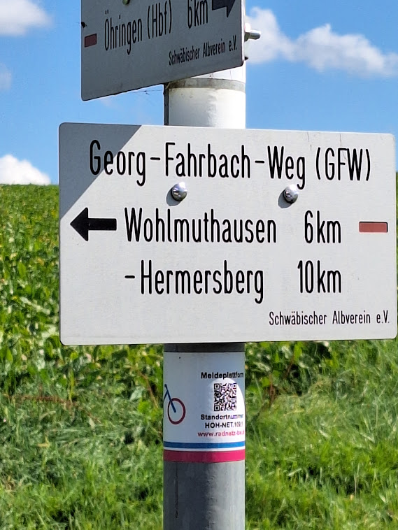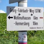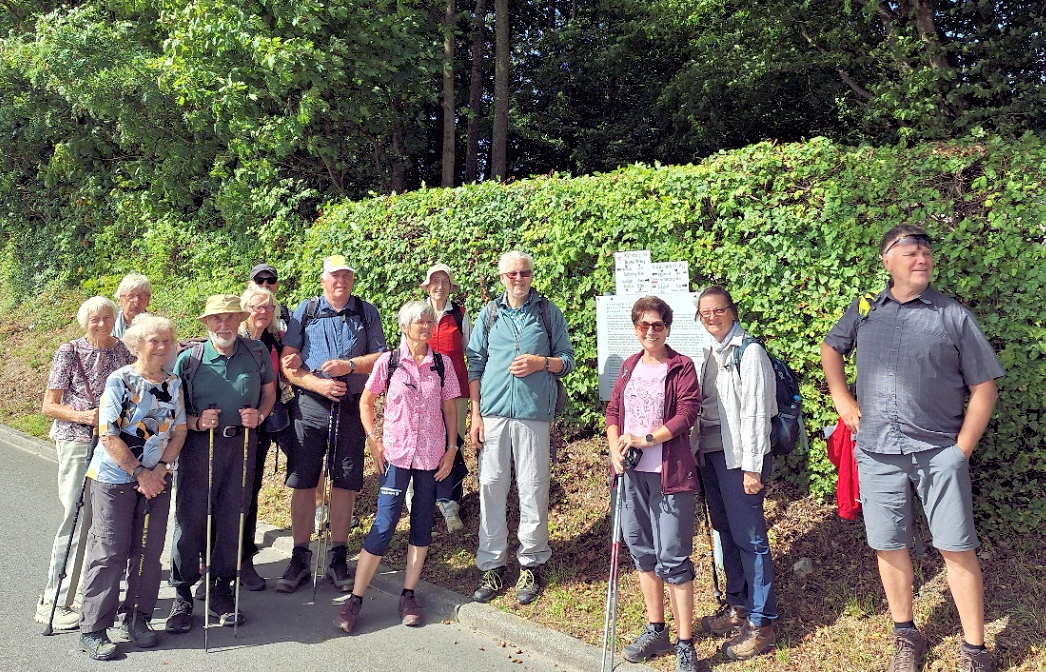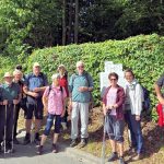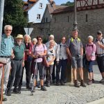 In Niedernhall, mit seinem historischen Rathaus, dem Götzenhaus in dem einst Götz von Berlichingen zur Schule ging, trafen wir auf unsere letzte Teilnehmerin, die uns auf dem Aufstieg hinauf zur GFW-Eiche und hinunter bis Criesbach begleitete. Die letzten Meter erklommen wir durch einen Rebhang, was unsere drei 90-jährigen Mitwanderer, Traute, Manfred und Ruth ohne Problem bewältigten. Bei einem Glas Wein und Hohenloher Wibele vermittelte uns Heide, ein Hohenloher Albvereins Urgestein, das Leben und Wirken von Georg Fahrbach. An der Kelter in Criesbach endet der GFW und auch unsere Wanderungen nach 9 Etappen mit insgesamt 120 km Länge, 3560Hm Aufstieg, 3485 Hm Abstieg innerhalb von 4 Jahren. Die Heimfahrt unterbrachen wir noch in Ernsbach im Bistro des Kocherwerkes, einem Museum für Verbindungstechnik der Hohenloher Schraubenhersteller. R.C.