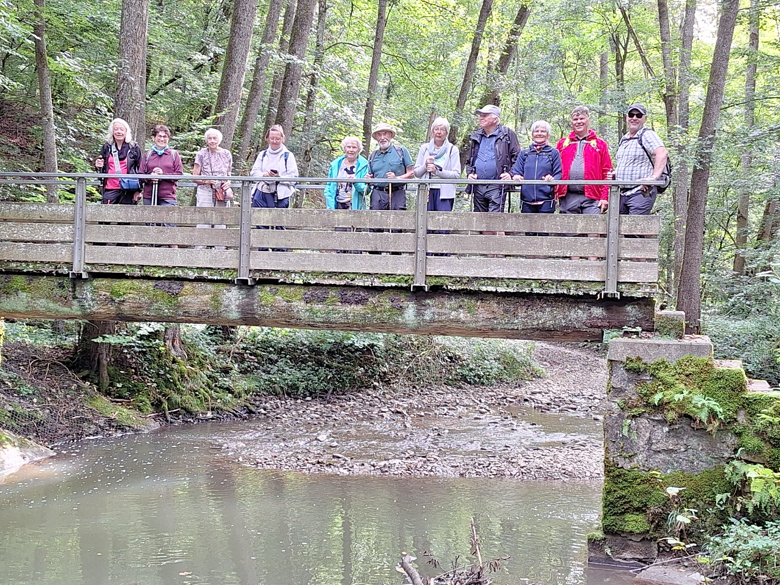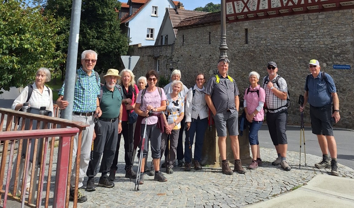 Der 2. Wandertag startete wieder in Wohlmutshausen und führte uns auf schmalem Pfad steil abwärts ins romantische Kupfertal mit dem Schwarzen Steg. Der Aufstieg erforderte einiges an Anstrengung, bevor wir die Höhe beim Schloss Hermersberg erreichten. Leider verwehrte uns ein Angestellter des Schlossgutes, mit dem Hinweis auf Privatbesitz, eine ausgiebige Erkundung. Den Besitzer dieses Kleinodes wollte er uns auch nicht verraten. Von der Höhe der Siedlung Giebelheide, der neue Ortsteil von Niedernhall, hatten wir einen wunderschönen Ausblick auf das Kochertal und unsere vor uns liegende Wanderstrecke nach Criesbach.