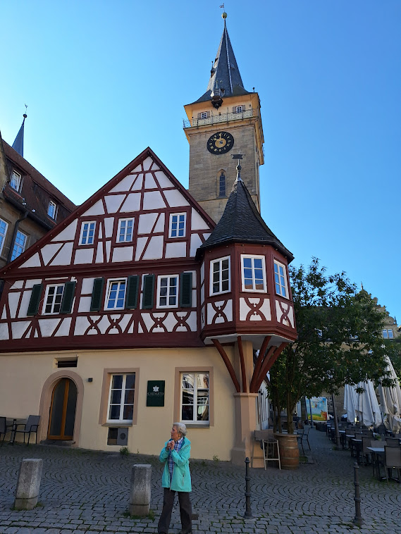 Bei bestem Wanderwetter machten wir uns von Öhringen aus auf, die beiden letzten Etappen des Georg-Fahrbach-Weges zu erwandern. Der blumenreiche Hofgarten, im Jahr 2016 als Gartenschaugelände umgebaut, war ein schöner Auftakt zur Tour, die uns durch das Schloss, über den Marktplatz mit seiner spätgotischen Stiftskirche und dem Kreuzgang führte. Stadtauswärts, durch die Karlstadt, durchschritten wir das obere Tor, das 1792 im klassizistischen Stil von Fürst Friedrich Karl von Hohenlohe erbaut wurde und jetzt den Abschluss der Fußgängerzone bildet.